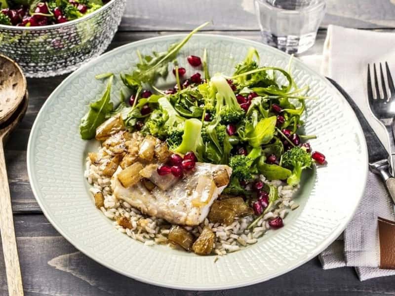 Kok ris etter anvisning på pakken. Sett på en kjele med lettsaltet vann til koking av brokkoli. Del brokkolien i små buketter og stilken i strimler. Kok brokkolien i 3-4 minutter og avkjøl raskt i rennende kaldt vann og la den renne av seg i et dørslag. Rens ut kjernene av granateplet (se tips). Skyll og tørk rucculasalaten. Bland grønnsakene med limesaft, olivenolje, salt og pepper. Kutt løk i terninger. Skyll fisken i kaldt vann, tørk av den og del den fisken i serveringsstykker.Krydre fisken med salt og pepper. Stek fisken og løkterninger, i en stekepanne med margarin, i omtrent 3-4 minutter på hver side til at fisken er gjennomvarm og flaker seg ved et lett trykk med fingeren. Server stekt torsk med stekesjy, lun brokkolisalat og kokt fullkornsris.