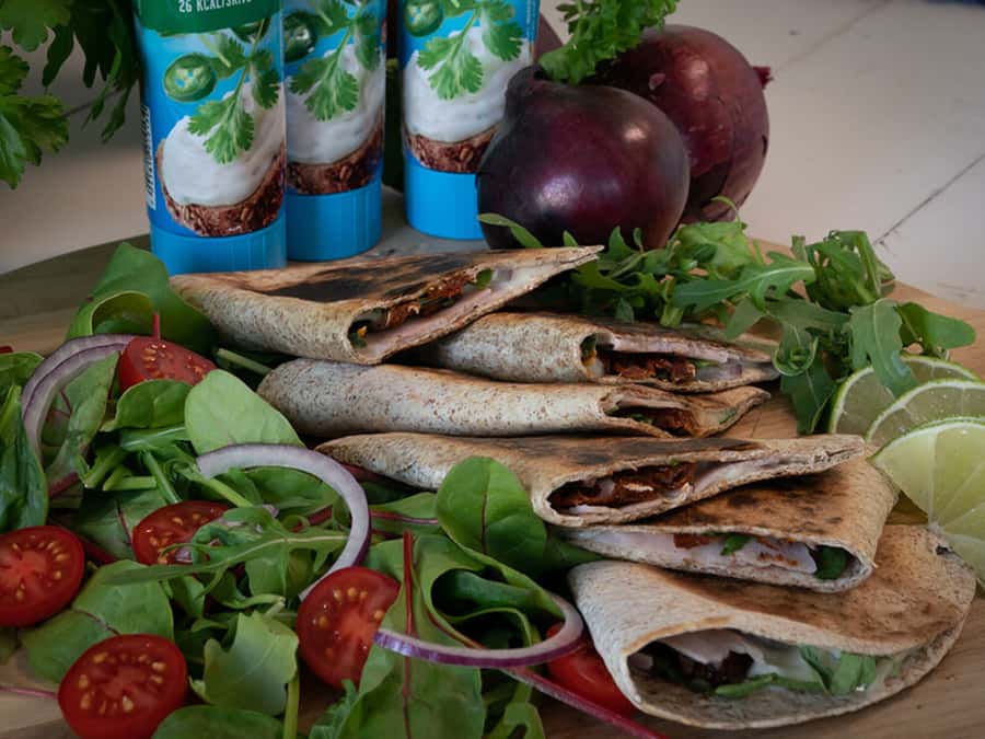 Vi har i tillegg brukt rødløk, ruccola og soltørket tomat, sammen med litt kokt skinke. Ingredienser som spisspaprika, vårløk, sopp og spinat, passer også godt i de pannestekte lefsene. Den myke Jalapeño-osten med litt sting i, binder det hele sammen.