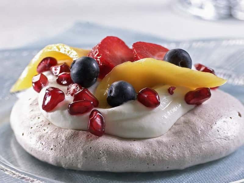 Lag lekre små marengskaker med frisk frukt og fargerike bær til romjulens dessert. Maregnsbunnene kan du lage noen dager i forveien, så pynter du dem med krem, frukt og bær rett før servering.