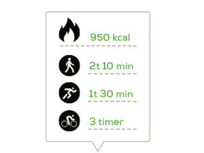 Det er fort gjort å undervurdere hvor mange kalorier det er i en del mat, men ved å merke hvor lenge man må trene for å forbrenne matvaren vil man kanskje tenke mer over hvor mye energi enkelte matvarer gir.
