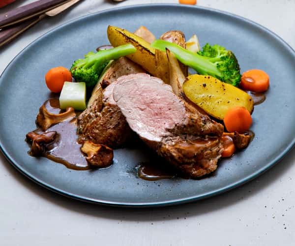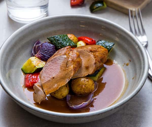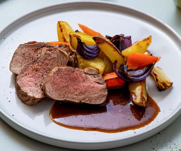 Ytrefilet av svin med ovnsbakte grønnsaker og rødvinssaus