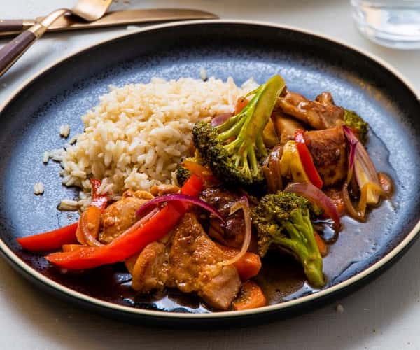 Stir fry med ingefærmarinert kylling, brokkoli og fullkornsris
