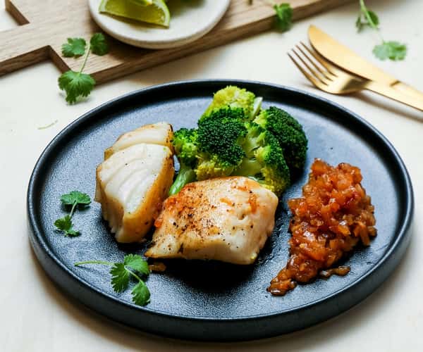 Pannestekt torskefilet med knuste poteter og soya- og ingefærsjy