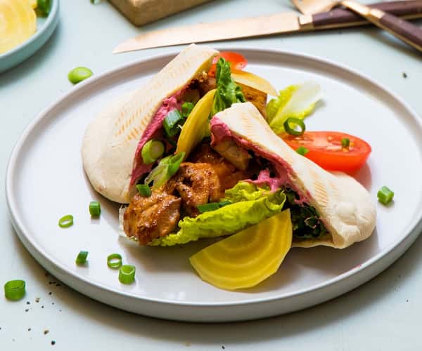 Paprikastekt kylling og kikerter i fullkornspita med rødbetehummus og syltet gulbete