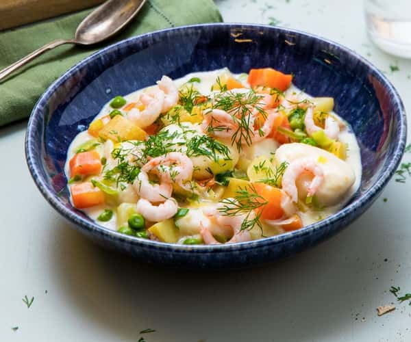 Enkel fiskebollegryte med purre, poteter, Lyngen-reker og dill