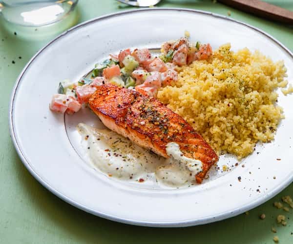 Krydderstekt ørret med fullkornscouscous og agurk- og tomatsalat