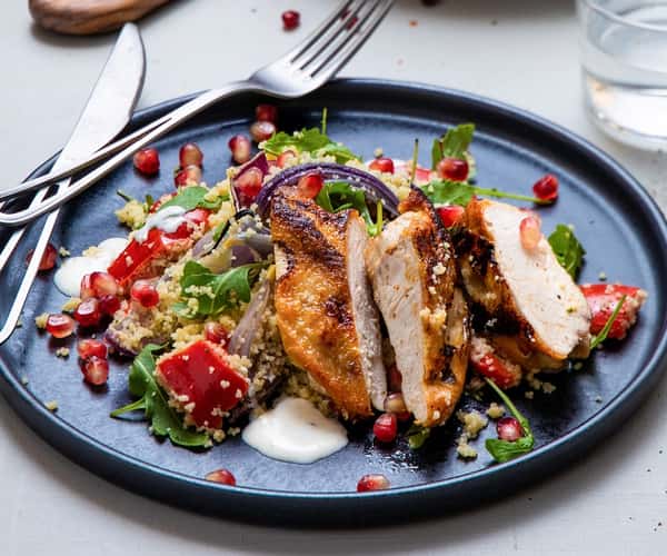 Kyllingbryst med couscoussalat, granateple, ruccola og urtedressing