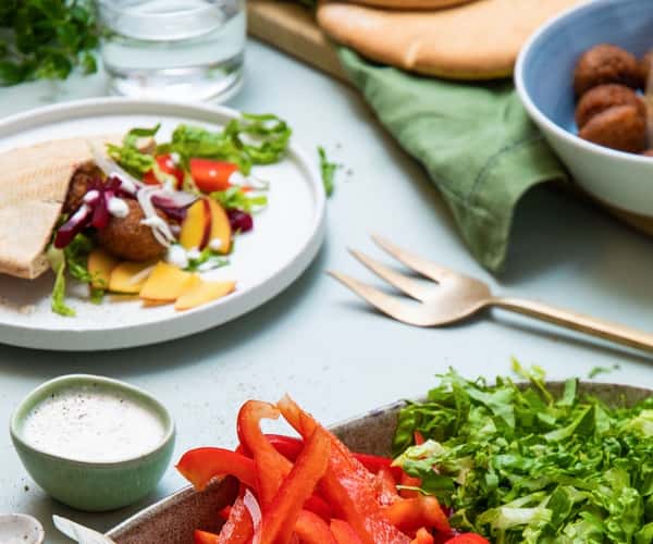 Falafeler i fullkornspita med plommesalat, rødbeter og lett urtedressing