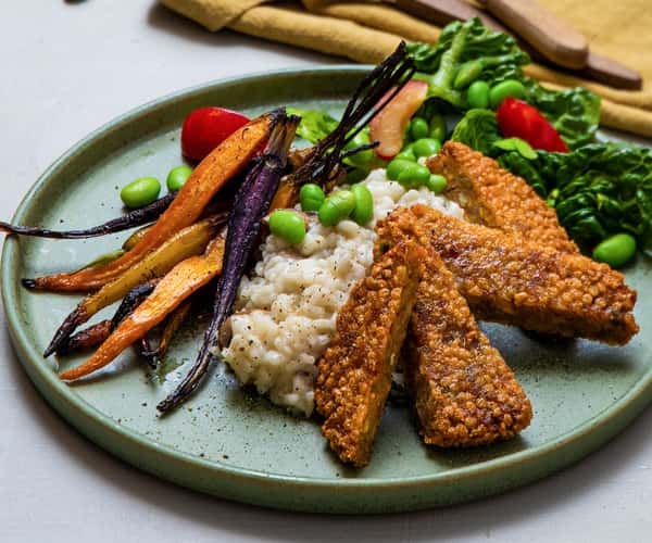 Vegetarschnitzel med sopprisotto, honningbakte gulrøtter og plommesalat