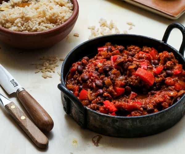 Chili con carne med sorte bønner, paprika og fullkornsris