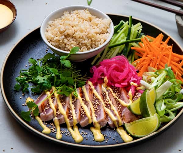 Ørret tataki med fullkornsris, vårløk og curry- og mangodressing