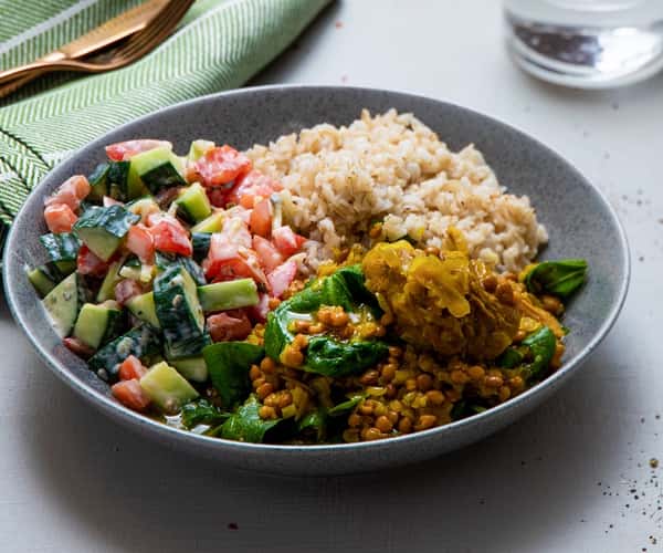 Srilankisk svinekjakecurry med spinat, fullkornsris og raitasalat