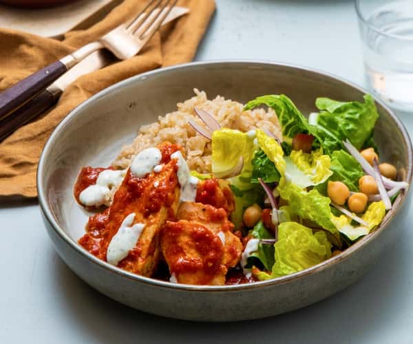 Kylling i garam masala-saus med kikertsalat og urteyoghurt