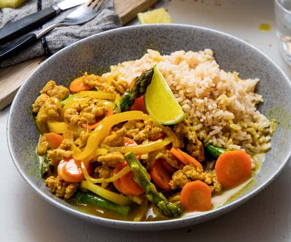 Wok med kyllingkjøttdeig, asparges, gul karrisaus med ingefær og fullkornsris