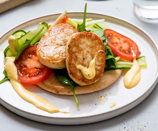 Fiskekakesandwich i fullkornspita med spinat og curry- og mangodressing