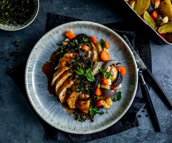 Kyllingfilet med ovnsbakte grønnsaker og rødvinssaus