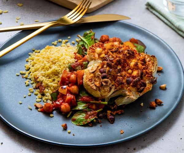 Fetabakt blomkål med hasselnøtter, couscous og kikerter i tomatsaus