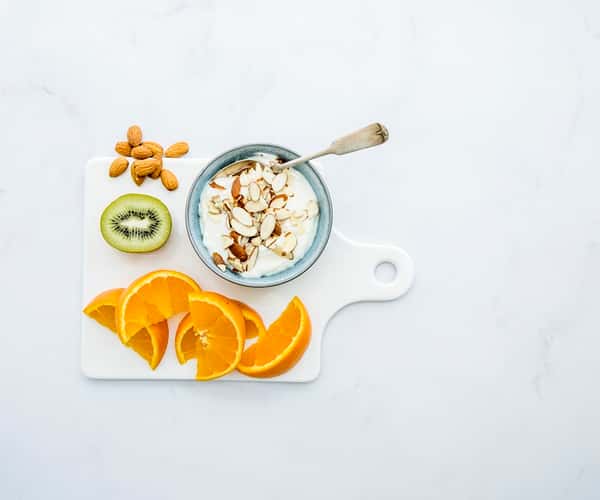 Mellommåltid med yoghurt, mandler og frukt