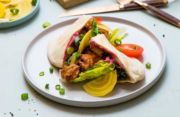 Nystekt pitabrød med saftig kylling, fyldig rødbetehummus, friske grønnsaker og syrlige beter - en sunn, smakfull og mettende middag.